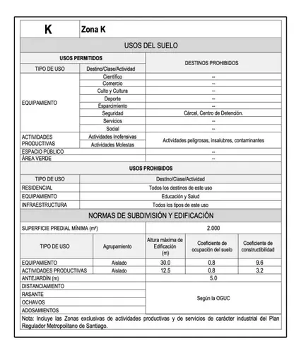 Terreno Industrial en Venta, en zona urbana de Pudahuel. Colindante con autopista Vespucio Norte; 2.000 metros a autopista Costanera Norte; 200 metros a Ruta 68, Camino a Valparaíso, y 4.000 metros al Aeropuerto AMB. Topografía variable con leve inclinación hacia autopista Vespucio Norte. Urbanización de la zona para alternativas, se encuentra urbanizado con los Servicios de Energía Eléctrica, Agua Potable, Aguas Servidas, Alumbrado Público y Aguas Lluvias. Cada cliente solicita su conexión a cada uno de los servicios, conforme a los requerimientos específicos de su proyecto. Servicios Básicos: Urbanización de la zona para alternativas, se encuentra urbanizado con los Servicios de Energía Eléctrica, Agua Potable, Aguas Servidas, Alumbrado Público y Aguas Lluvias. Cada cliente solicita su conexión a cada uno de los servicios, conforme a los requerimientos específicos de su proyecto. Vecindad consolidada: En la vecindad de Alt. 1 se encuentran bodegas y centros de distribución; terminales de buses; PRT clase A, oficinas. En la vecindad de Alt. 2 y 3 se encuentra Bodegas con oficinas, áreas de estacionamientos y AMB. Standar de Urbanización: El estándar de la Urbanización para todas las alternativas es de calles con perfil de 20 mt. compuesto por 10,5 mt de calzada y 2 veredas de 4,75 mt cada una, la calles son en asfalto. Normativa Urbana: El terreno de Alt. 1 se emplaza en la Zona K de la zonificación del Plan Regulador Comunal de Pudahuel, cuyos usos de suelo permitidos son actividades productivas, inofensivas y molestas, además de equipamiento, con normas urbanísticas de acuerdo cuadro adjunto.